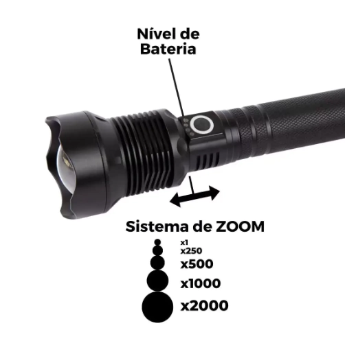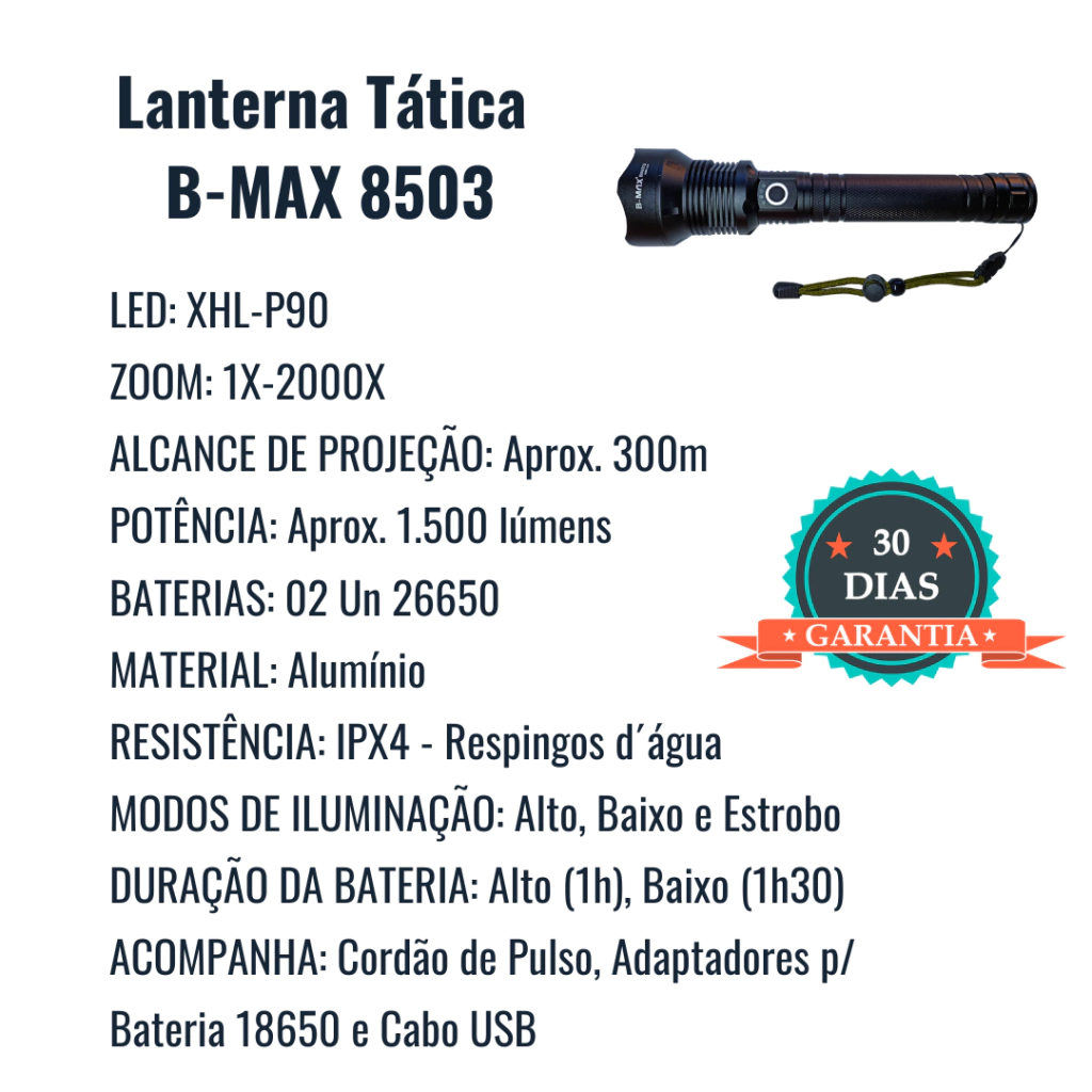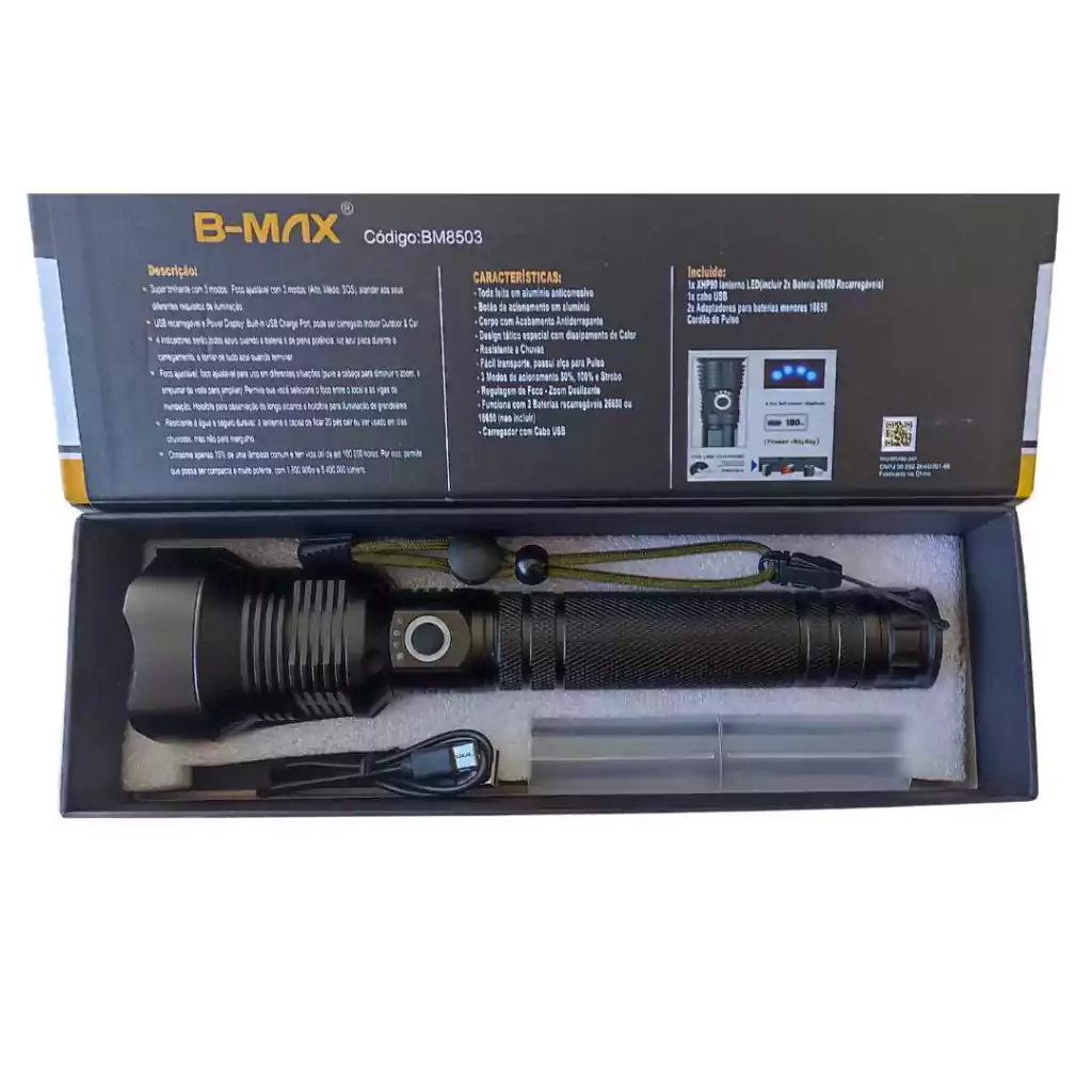 Equipada com Led XHL-P90, um dos melhores do mercado, esta lanterna gera uma potência de aproximadamente 1.500 lúmens.